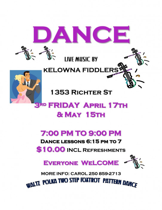 Seniors Outreach - Recreation Centre 1353 Richter St., Kelowna, British Columbia, CanadaOn the 3rd Friday of APRIL, come join us for a night of fiddling fun and dancing. Dance to Old Time music by Kelowna Fiddlers, 2 steps, foxtrots, waltzes, pattern […]